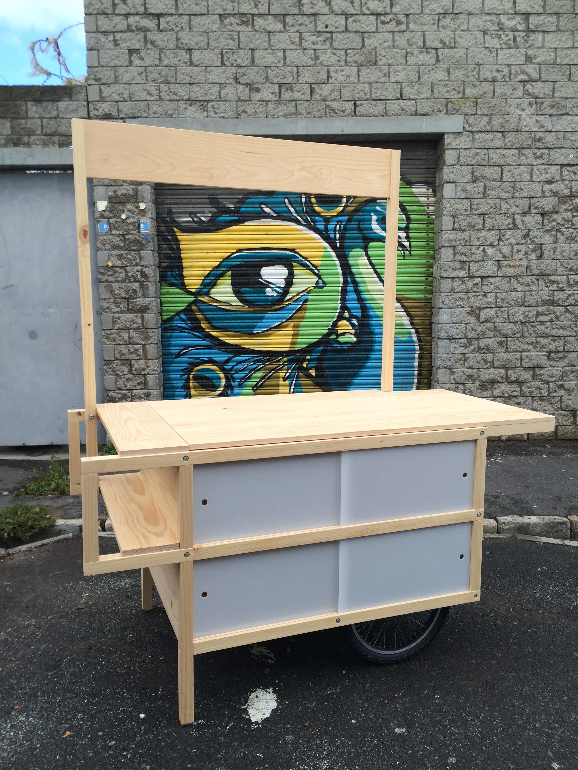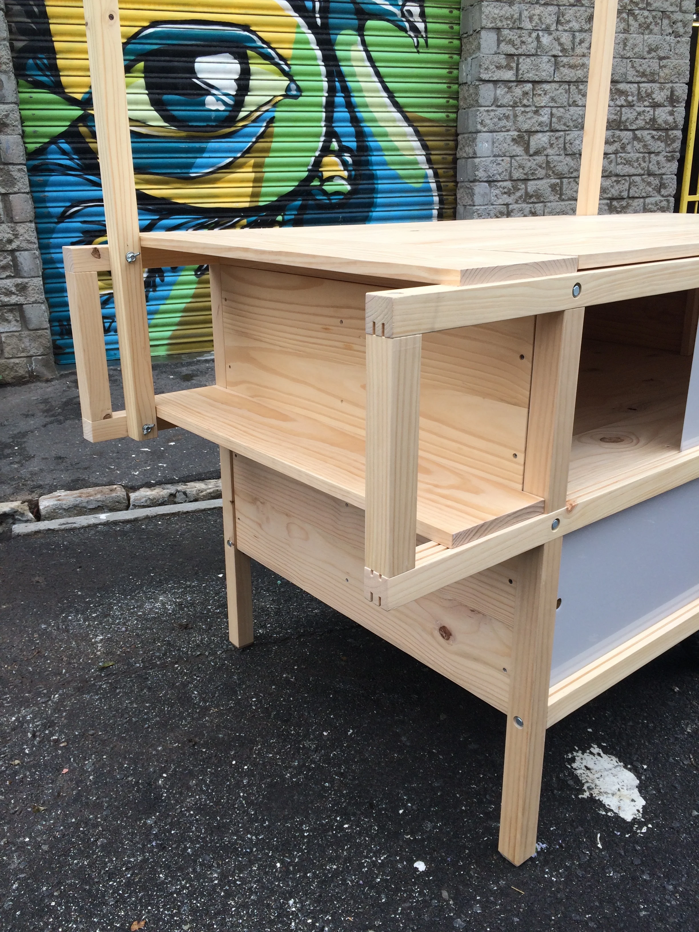 Made from Radiata Pine, with steel fixings and Perspex sliding doors.